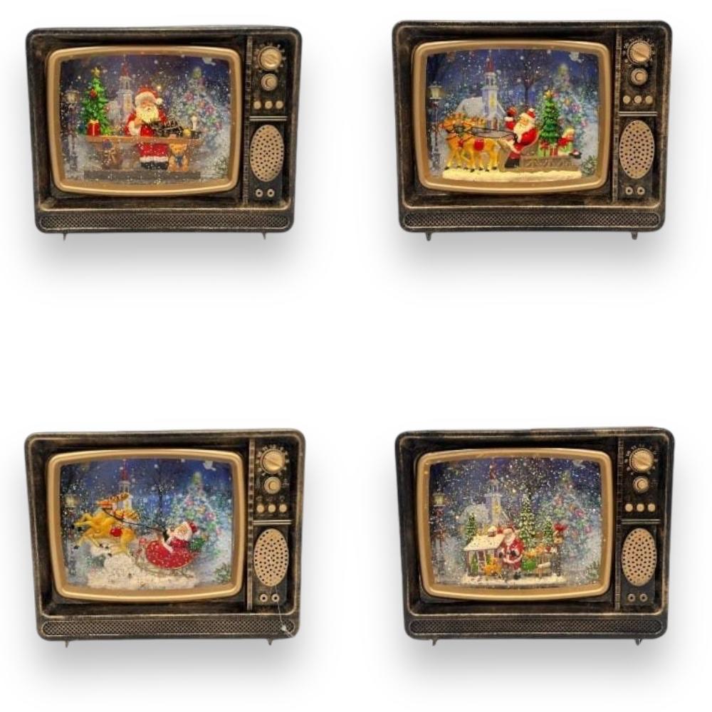 Este adorno con forma de televisor vintage o también conocido como Globo de Nieve, incluye una escena navideña en su interior, Luces LED y reproduce musica festiva navideña.