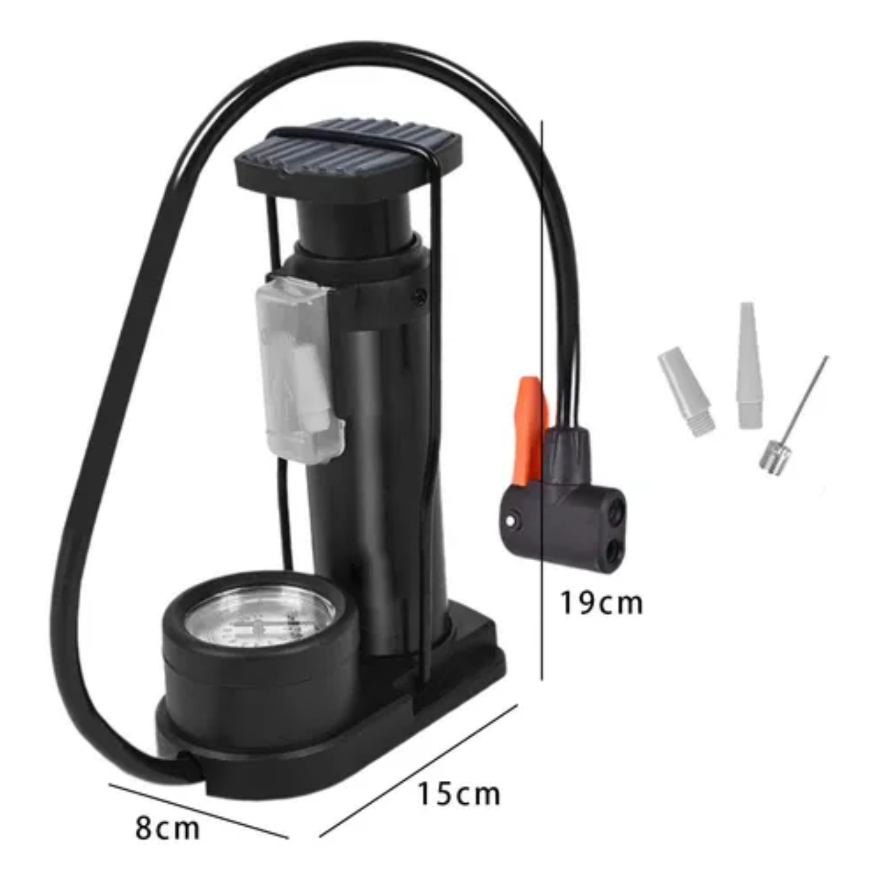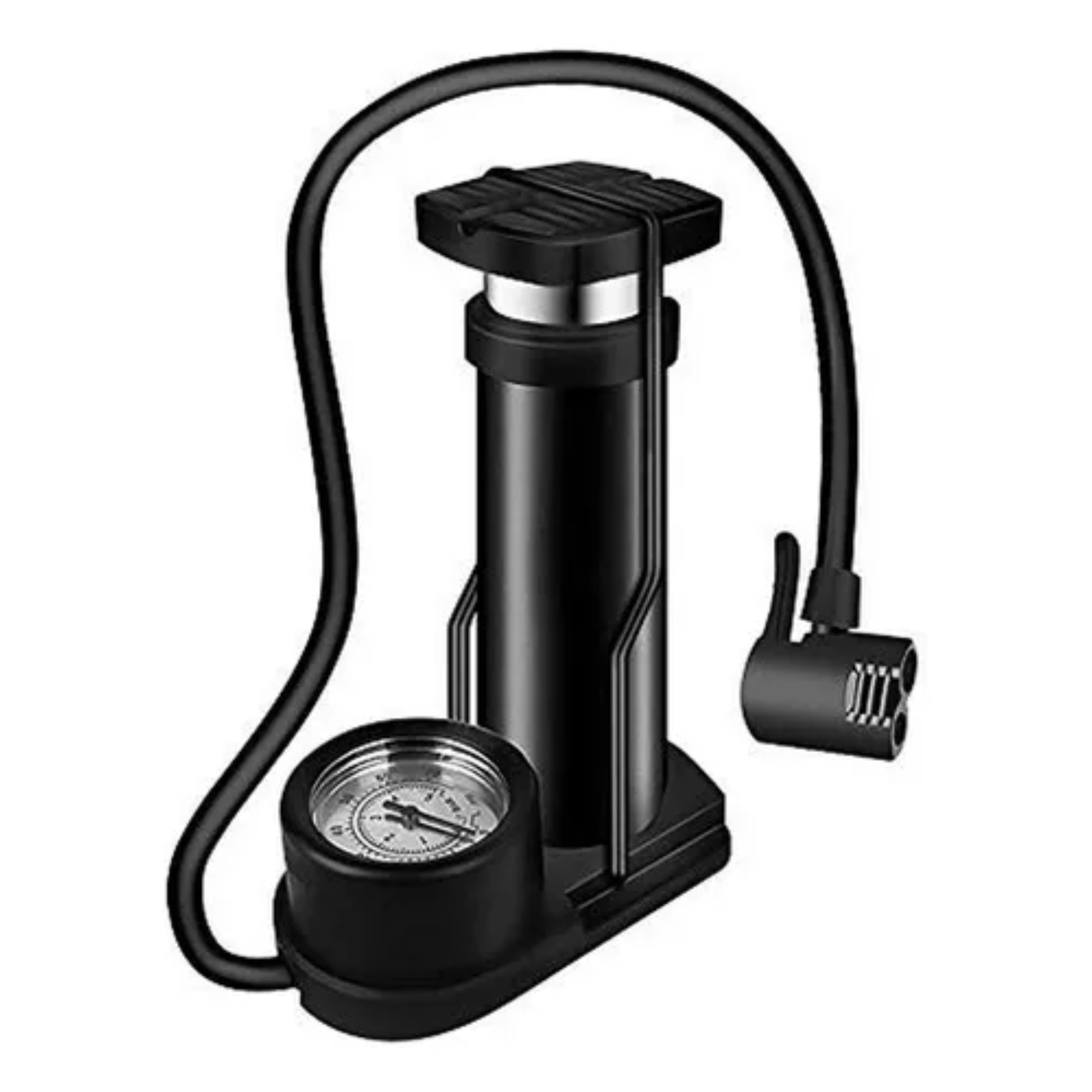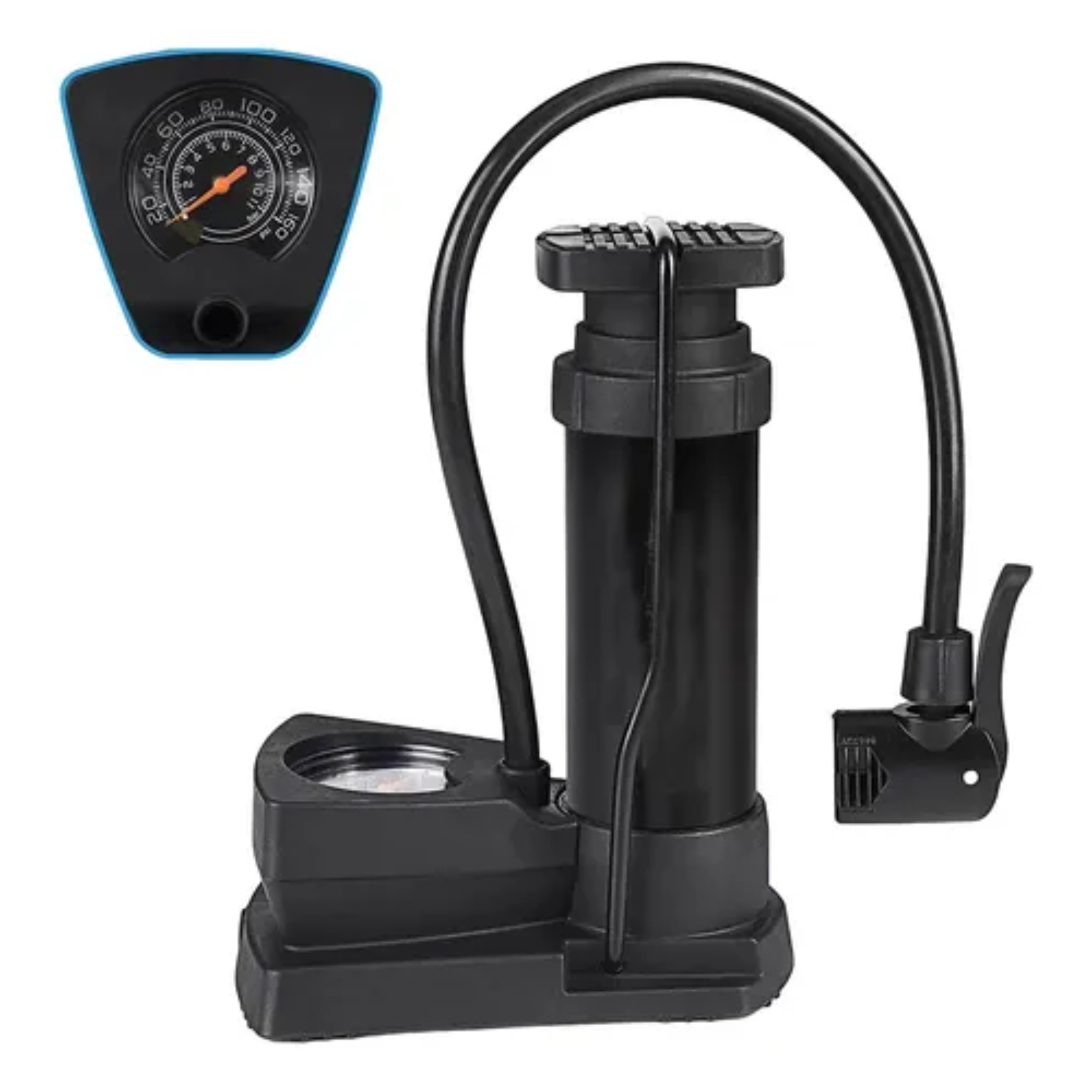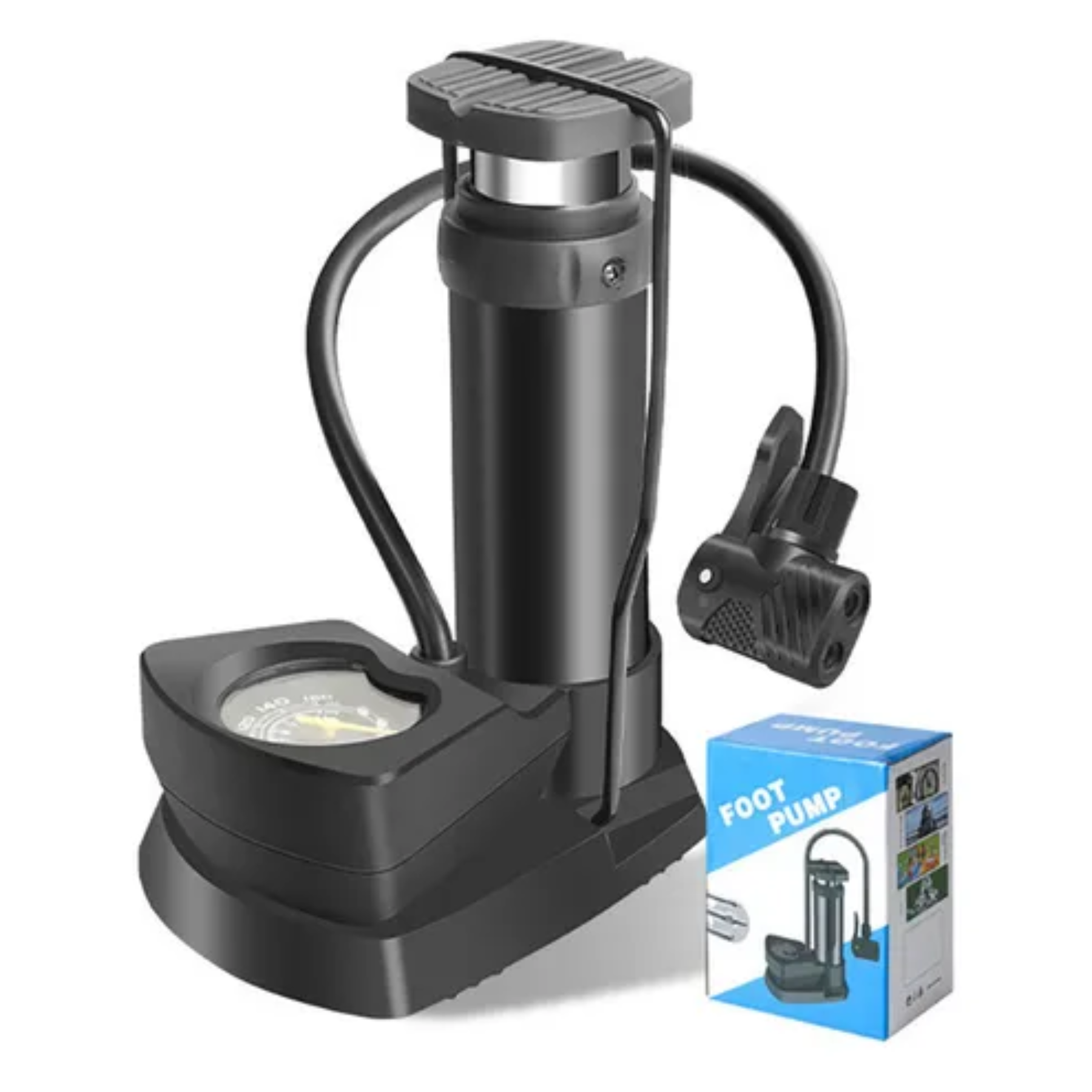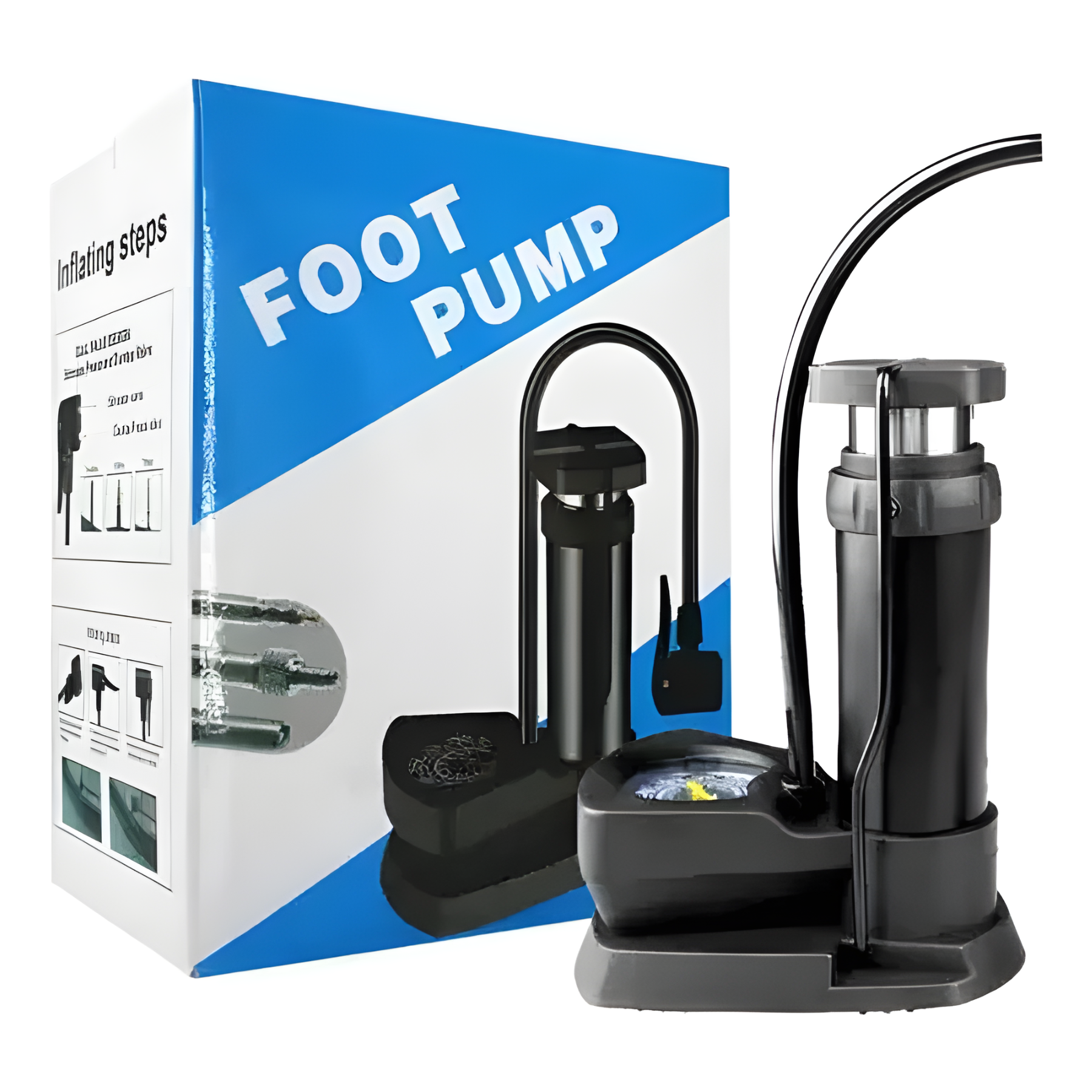 La bomba inflador de pie es una herramienta manual diseñada para inyectar aire a presión en diferentes tipos de neumáticos y objetos inflables. Generalmente cuenta con un pedal o palanca que se acciona con el pie, un manómetro para medir la presión, una manguera flexible y boquillas intercambiables que permiten adaptarla a distintos tipos de válvulas (Schrader, Presta, o de aguja para pelotas). Está fabricada con materiales resistentes como acero o aluminio y se utiliza tanto en el hogar como en talleres o durante viajes.