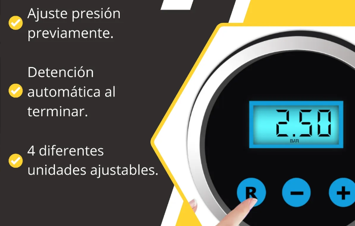 Nuestro Compresor de aire de 12V, te ayudará en cualquier momento y lugar, debido a su portabilidad y tamaño, lo hacen una herramienta obligatoria para el auto y el hogar. Cuenta con linterna de alta potencia para alumbrar y visualizar de manera correcta el inflado en la noche. Su panel digital te ayudará a aumentar la visualización y precisión de inflado.