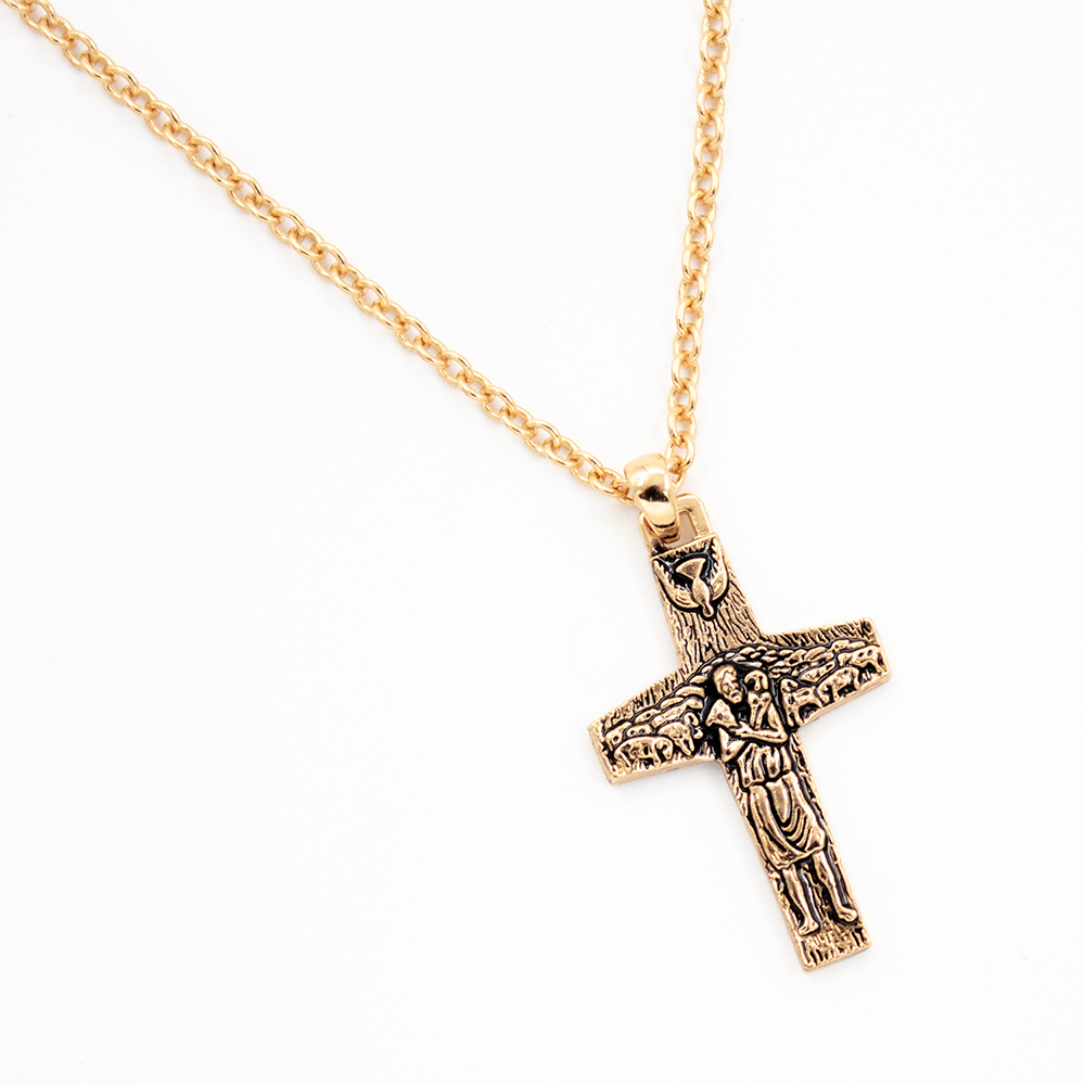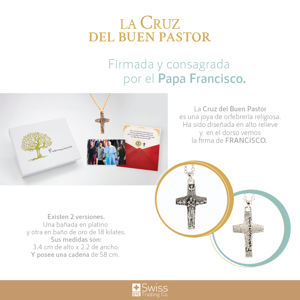 La Cruz del Buen Pastor es una verdadera joya de orfebrería religiosa. Ha sido diseñada en bajo relieve y en el dorso vemos la firma del Papa Francisco. Viene en dos versiones, una bañada en platino y otra con baño de oro de 18 quilates. Sus medidas son: 3.4 cm verticales x 2.2 cm horizontales y su cadena tiene un largo de 58 cm.