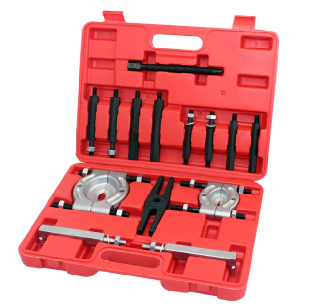 Extractor tipo guillotina especialmente concebido para la extracción de rodamientos externos, poleas, piñones etc.. El juego está equipado con dos extractores guillotina uno de 30-50mm y otro de 50-75mm.