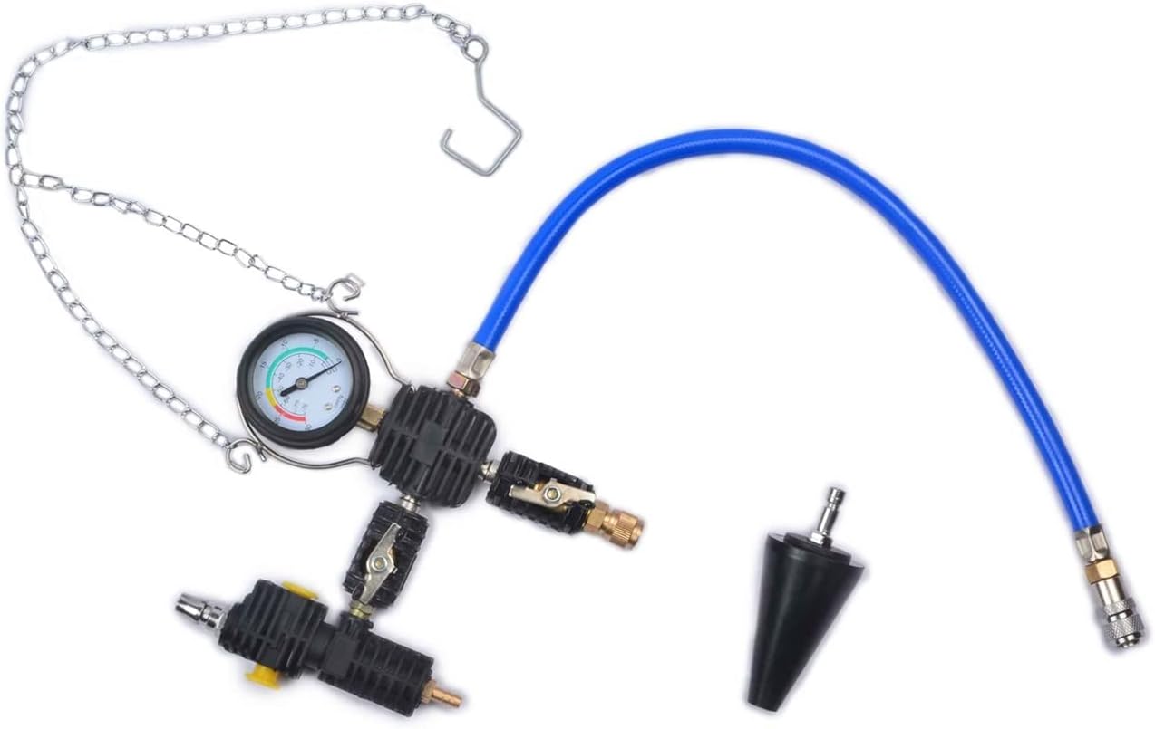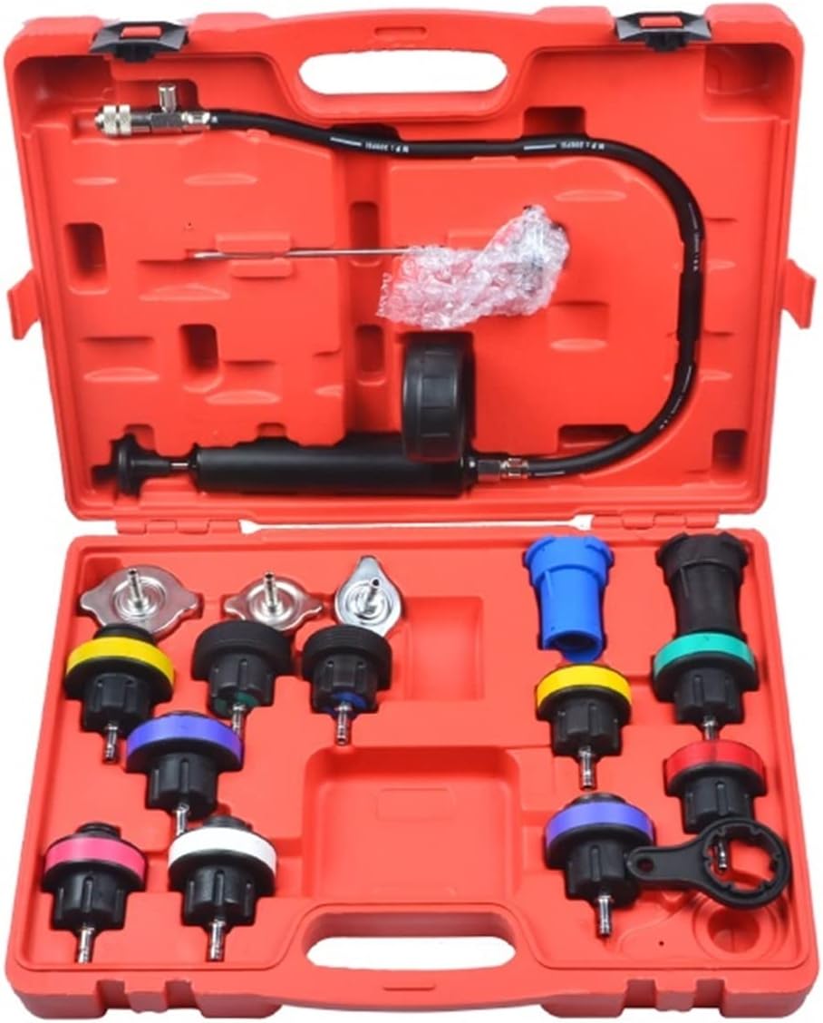 PackageList: 1 x Bomba de prueba de presión con manguera 1pc azul y 1pc. Adaptadores de prueba de tapa de radiador negros para probar la fuga original de la tapa del radiador. 20 tapas de prueba para probar sistemas de refrigeración en la mayoría de los vehículos nacionales e importados. 1 kit de herramientas de purga y recarga de sistema de refrigeración tipo vacío para un cambio rápido de refrigerante. 1 válvula de alivio, 1 desconexión rápida, 1 medidor de vacío, 1 adaptador universal. 1 medidor de temperatura, 1 entrada de aire, 1 funda de transporte