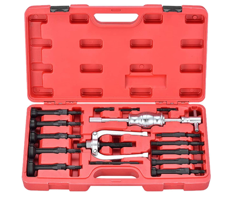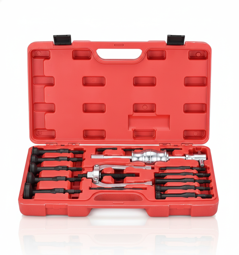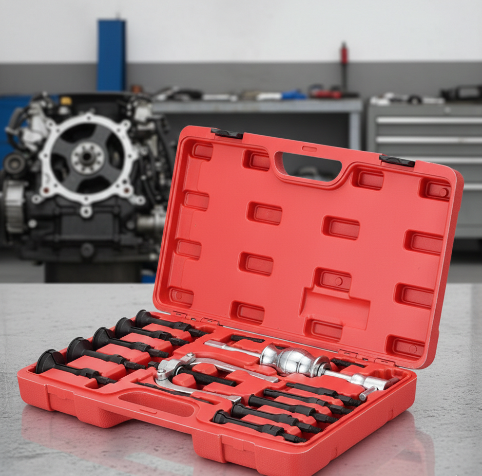 El Kit Extractor de Rodamientos 16 Piezas es la solución definitiva para uno de los desafíos más comunes en el taller: la extracción de rodamientos alojados en cavidades donde no se puede acceder por la parte trasera. Este set maestro ha sido diseñado para ofrecer una extracción limpia, rápida y sin daños en el alojamiento.