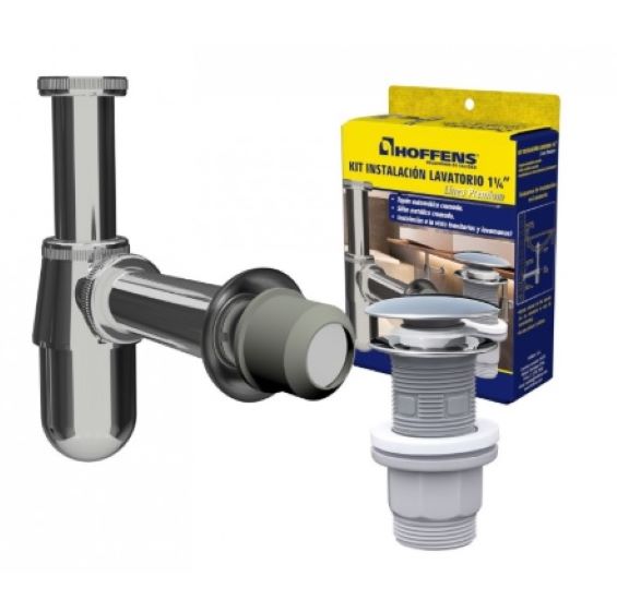 Este kit proporciona una solución de desagüe completa y elegante para cualquier lavamanos. Incluye un Sifón de 1 1/4" con salida recta, fabricado en metal con un acabado cromado (CROM), lo que no solo garantiza resistencia a la corrosión sino que también lo hace ideal para instalaciones a la vista (sin pedestal). El sifón es esencial para crear un sello hidráulico que bloquea la subida de malos olores y gases desde el alcantarillado.