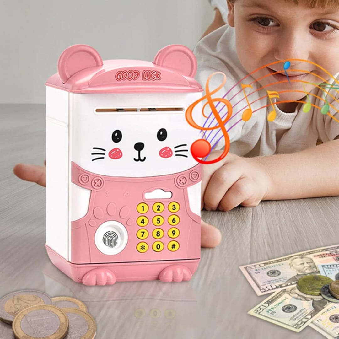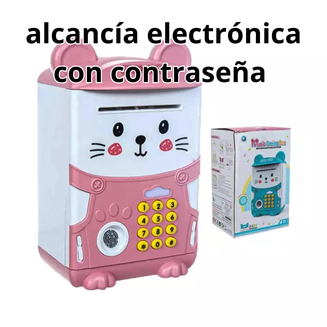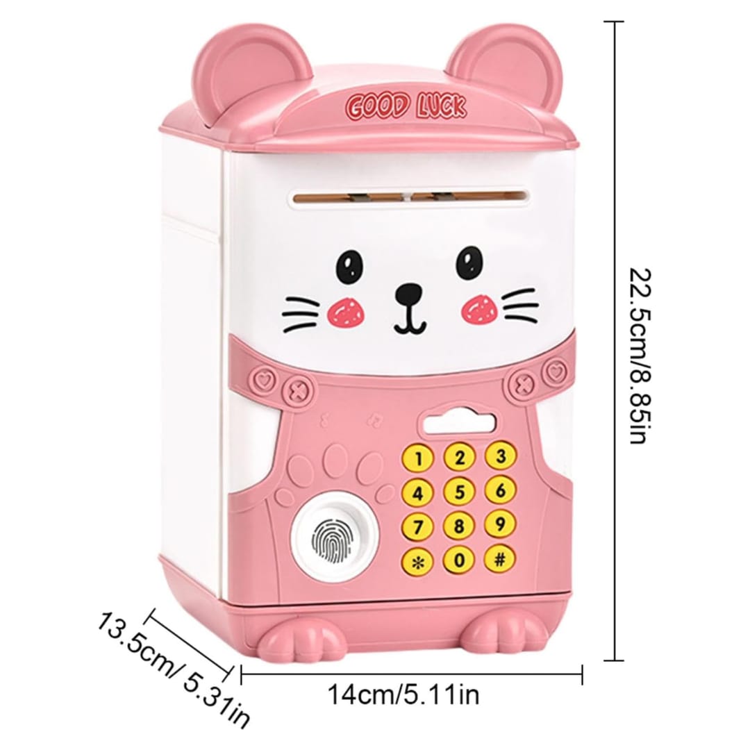 La alcancía electrónica con diseño de ratón rosa es una herramienta divertida y educativa diseñada para fomentar el hábito del ahorro en los más pequeños. Con un sistema de seguridad inteligente que incluye teclado numérico y simulador de huella dactilar, esta caja fuerte ofrece una experiencia interactiva y segura para que los niños protejan sus "tesoros" de forma tecnológica.