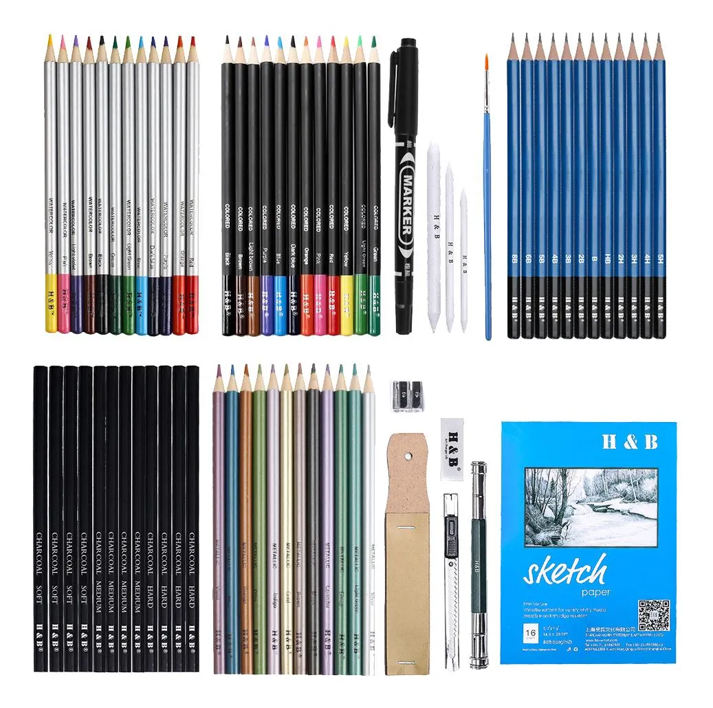 Una amplia variedad de lápices, lápices de dibujo 2H 3H 4H 5H HB 2B 3B 4B 5B 6B 8B, lápices y barras de carbón y barras de grafito con diferente dureza: suave/media/dura, le otorgan todas las gamas de tonos y mejoran su técnica de dibujo. Es adecuado para principiantes y artistas profesionales.