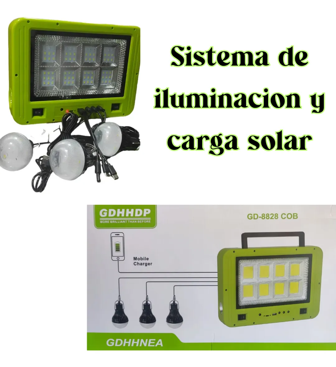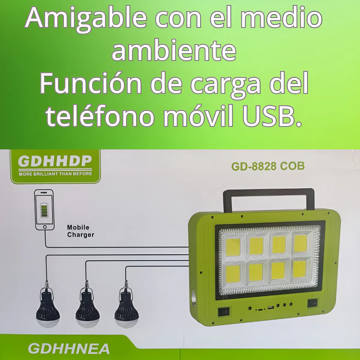 Este práctico dispositivo no solo carga teléfonos móviles y cámaras, sino que también proporciona iluminación LED con energía solar. Cuenta con un panel solar de alta eficiencia, tres bombillas LED de alto rendimiento y un cable USB con cuatro interfaces diferentes, compatible con dispositivos como teléfonos móviles, tabletas, reproductores MP3/MP4, cámaras digitales y videocámaras.