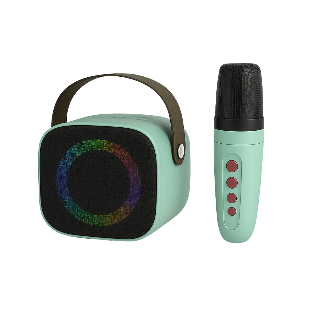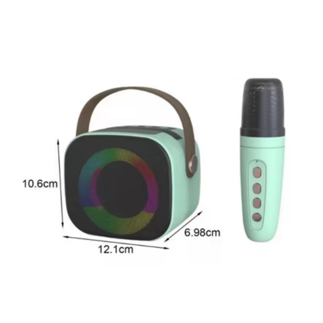Cuenta con conexión Bluetooth 5.3, función manos libres, batería recargable de 1200 mAh y micrófono incluido. Su subwoofer de 7W y efecto Echo Reverb garantizan un sonido envolvente y nítido.