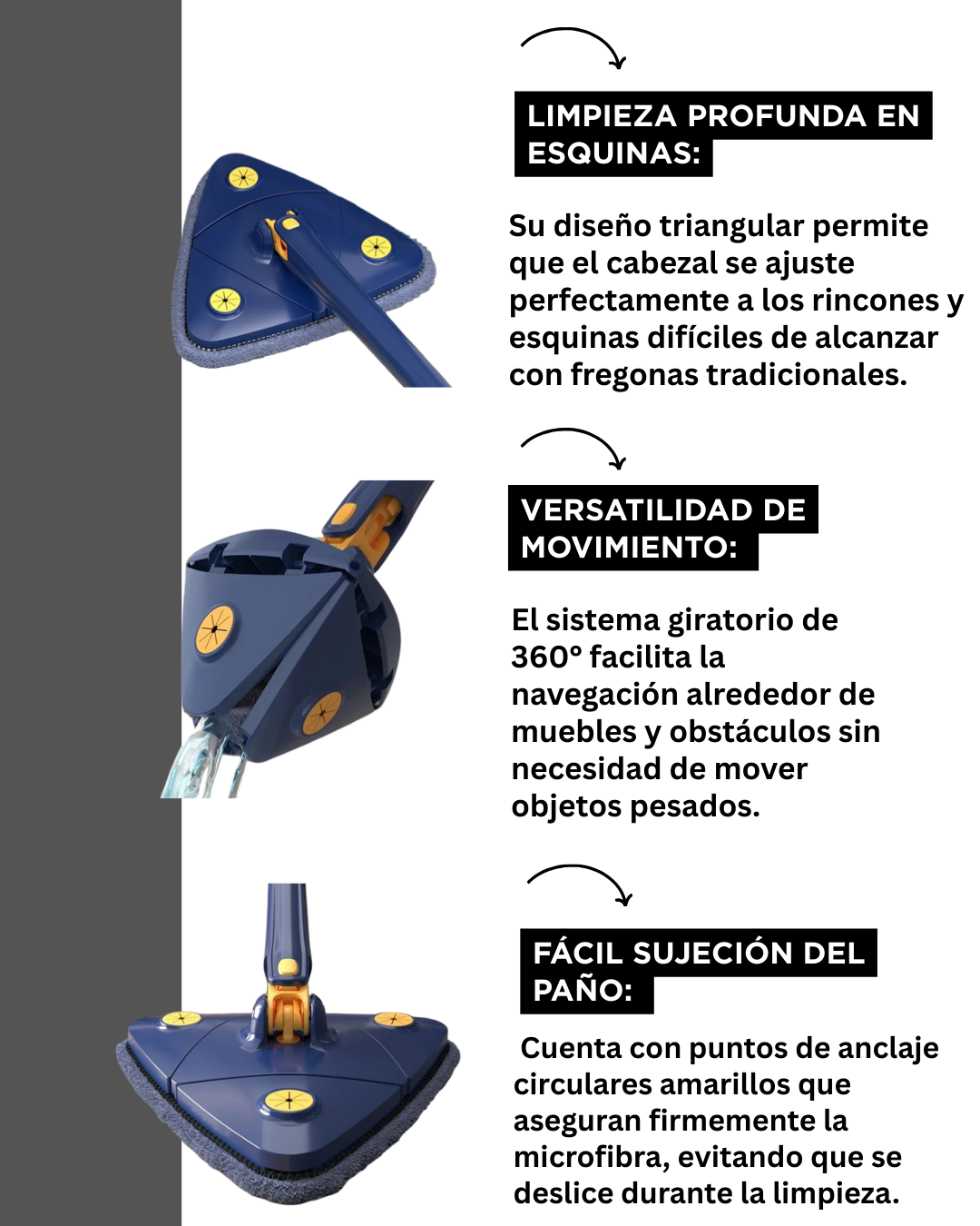 Limpieza sin Rincones Muertos: El diseño triangular junto al cabezal giratorio de 360° permite eliminar el polvo persistente en esquinas, paredes, techos y ventanas.