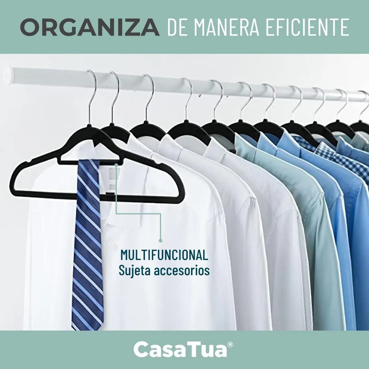- Ranuras laterales, barra inferior y conexión superior para colgar varias prendas a la vez, facilitando la organización.