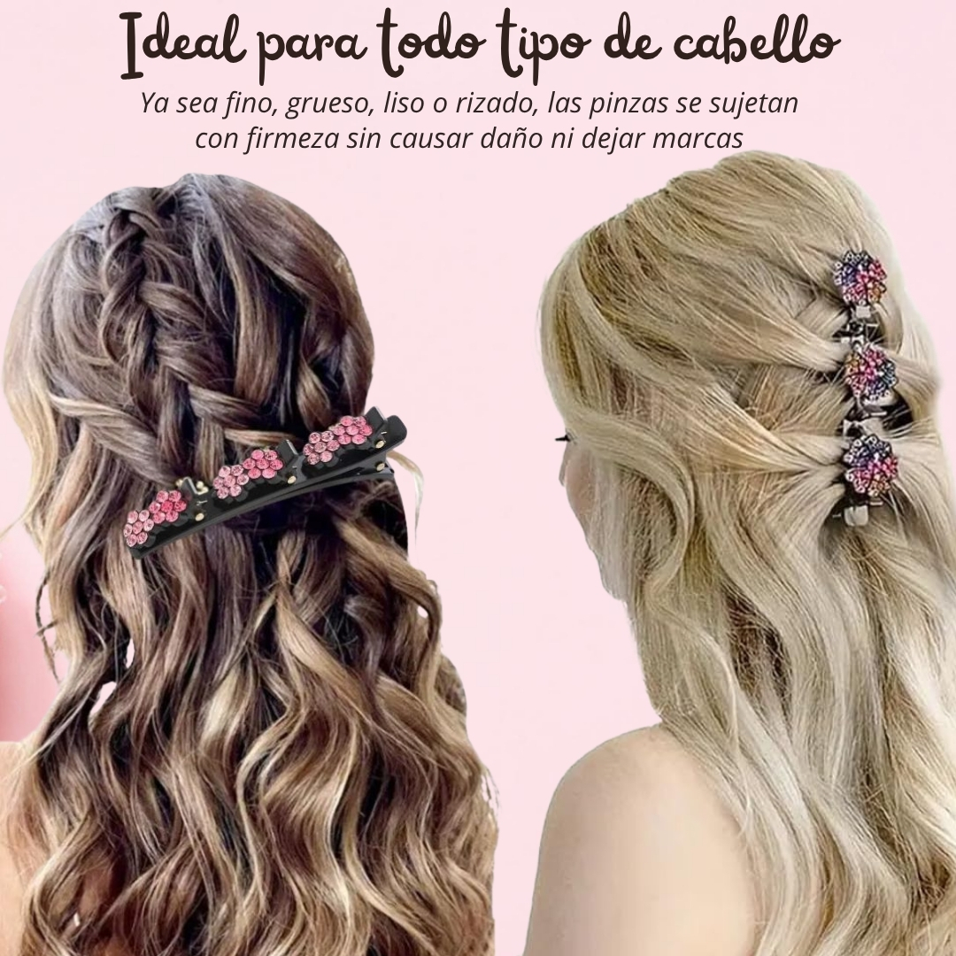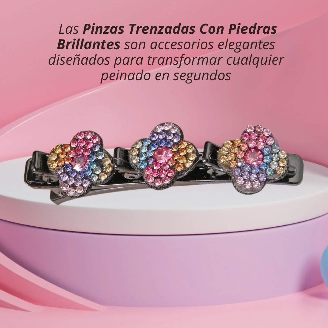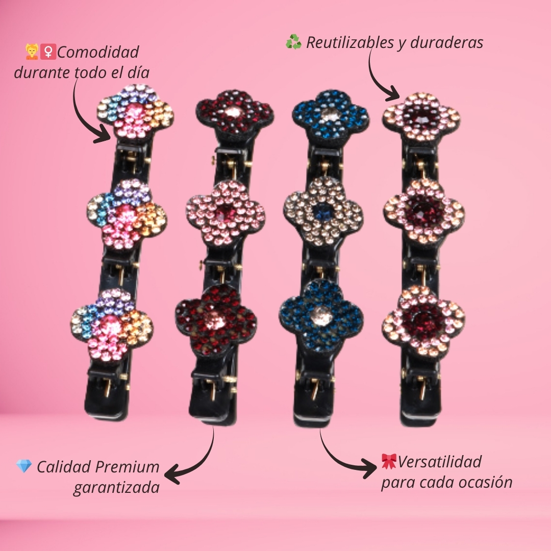 Set de 4 u 8 pinzas trenzadas con cristales brillantes, en colores variados.