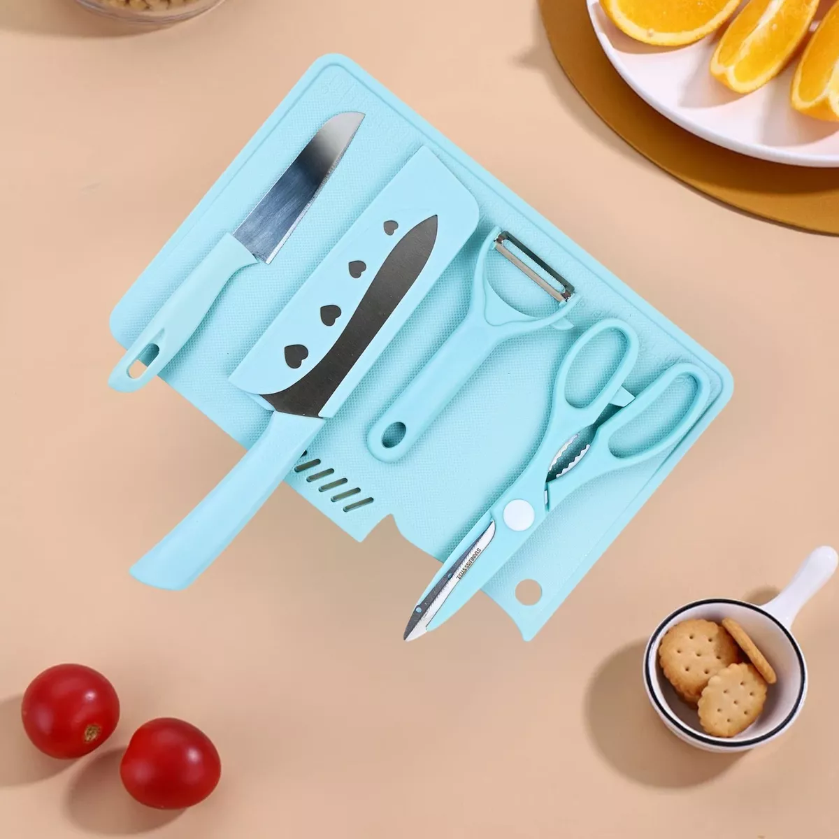 Set Todo en Uno: Tabla de cortar, cuchillos, tijeras y pelador.